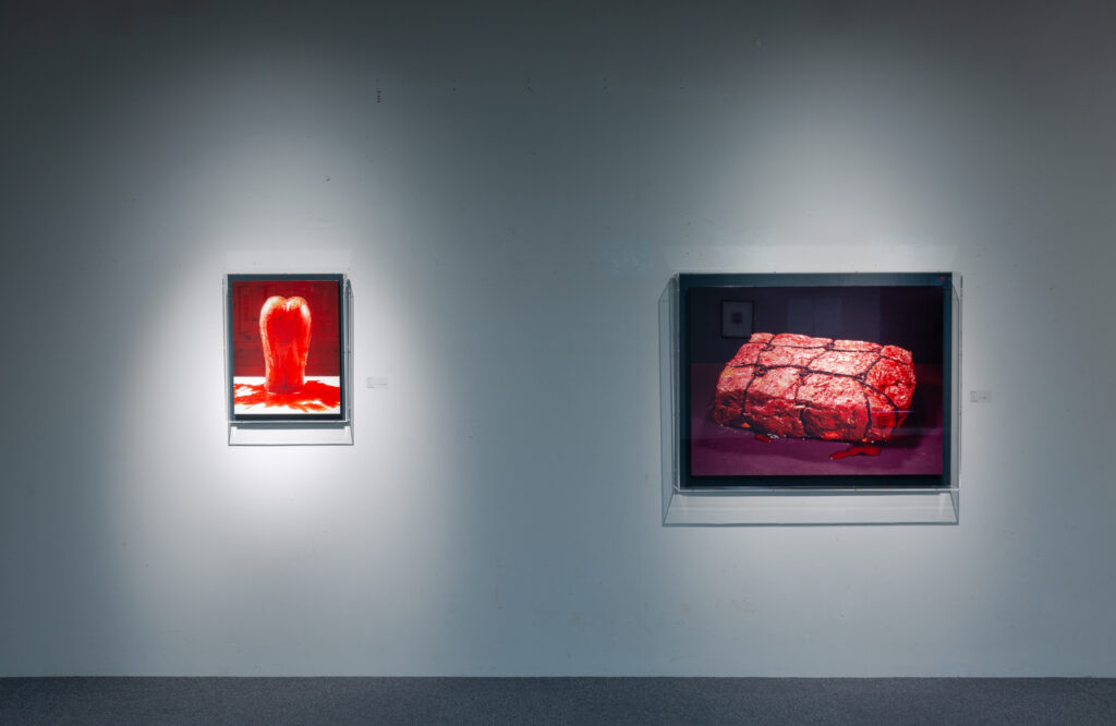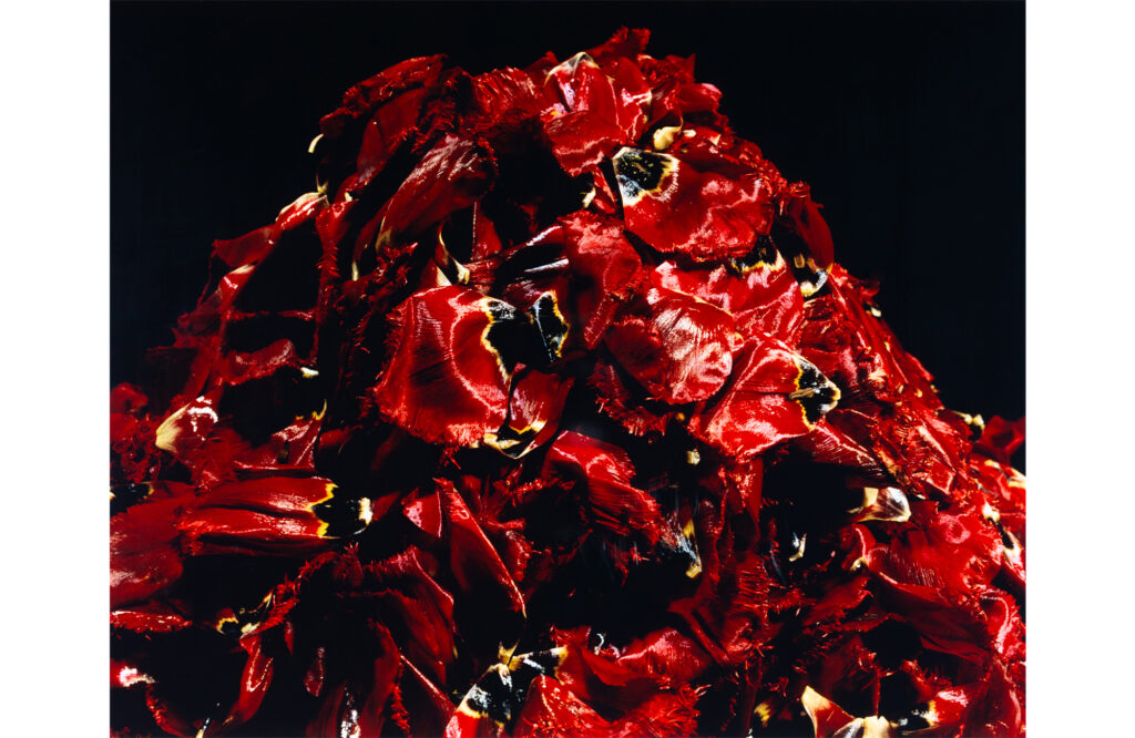 As is well known, Nakagawa makes unique choices in both floral materials and vessels. For example, manjushage, rubber tubing, and Chinese cabbage. As a result, his works are both animal-like and mineral-like, and he has created unique works that have never existed in the 600-year history of ikebana, such as his use of rotting flowers and pouring flower juice into his works. Still, to name a few of his favorite flower materials and works other than his masterpieces, we can list: apples = “Statue of Delicious,” roses = “Flowers Know,” lotus = “Flower Madness” and “Sky,” carnations = “Angry Leaves” and “Holy Book,” and tulips = “Devil’s Mountain” and “Tulip Alien. …….