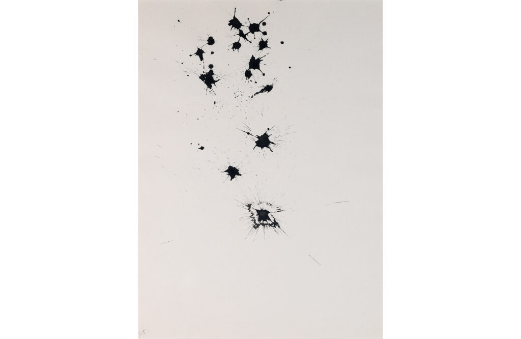One evening, Yukio Nakagawa visited my study and showed me a strange event on the table. While waiting for a self-made glass jar filled with only carnation flowers, probably hundreds, upside down on white Japanese paper, the flower liquid that oozed out quietly began to draw a trajectory on the paper. ( Abbreviated) On-site verification of the paradox that flowers can be done. And even the quiet disintegration of the stone-like stereotype of Ikebana can be seen. Probably, Ikebana’s self-analysis was happening.